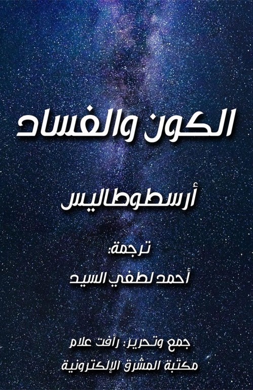 «الكون والفساد» كتاب يضم بين دفتيه أفكار فلاسفة اليونان القدامى من أقدم العصور وحتى عصر أرسطو؛ حيث يتناول أرسطو الآراء السابقة التي ناقشت الكون ومكوناته، والأجسام وماهيتها وفسادها؛ فيقوم بتشريح هذه الآراء، كما يعرض الأسس التي قامت عليها نظريته، ثم يَصُوغ هذه النظرية في قالب فلسفي بديع. كما يحتوي الكتاب على ثلاث رسائل موجَّهة إلى كبار معارضيه، وهم: «ميليسوس»، و«إكسينوفان»، و«غرغياس»، حيث يتناول نقدَ نظرياتهم المتعلِّقة بالكون، والنظرية الوجودية، كما ناقش فكرة وحدانية الله. وقد كان لهذا الكتاب عظيم الأثر على فلاسفة المسلمين في العصر الوسيط، حيث تُرجم لأول مرة على يد «ابن رشد»؛ الذي لقَّبَه «دانتي» ﺑ «الشارح الأكبر لأرسطو».